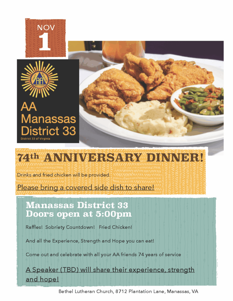 Check out the local upcoming events, items of interest, and our current newsletter in the navigation bar. You can also check out Events – Virginia Alcoholics Anonymous (aavirginia.org) and/or NVI Area Events – Northern Virginia Intergroup (nvintergroup.org).