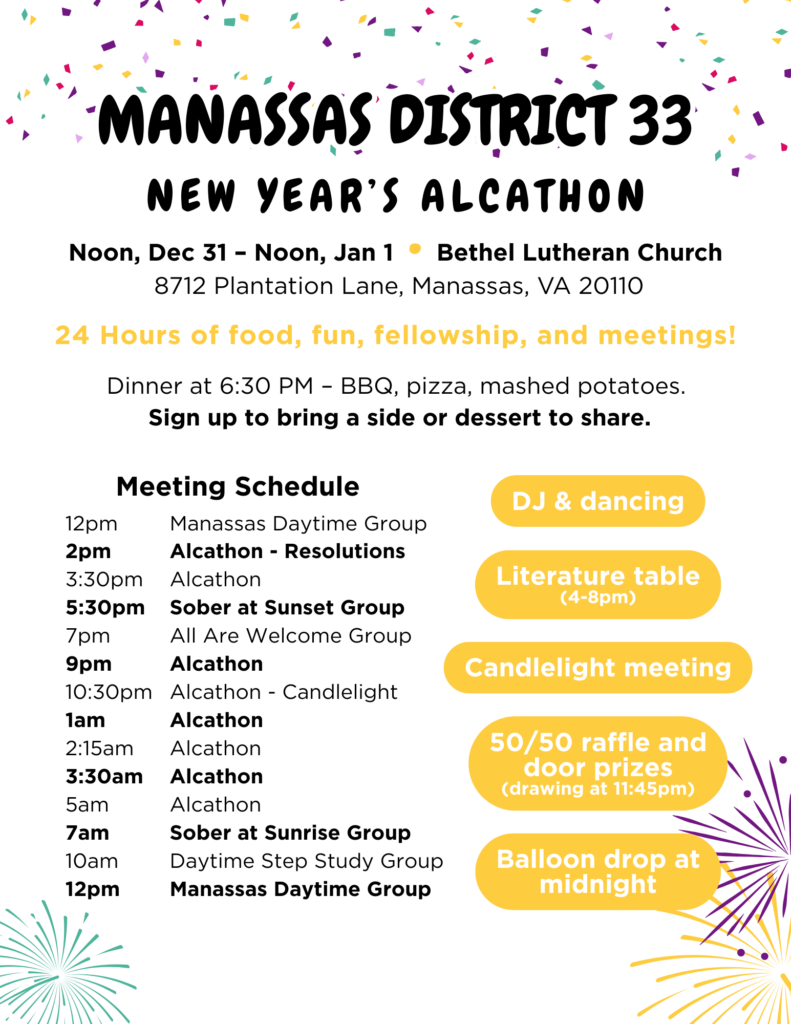 « All Events Manassas District 33 Alcathon 2025 – 2026 December 31, 2025 @ 6:30 pm – January 1, 2026 @ 12:00 pm Scan to New Year’s Eve – Sign up to bring a side or dessert to share – Or click here to signup on your desktop. Bethel Evangelical Lutheran Church 8712 Plantation Lane Manassas, VA 20110 United States + Google Map Add to calendar Google Calendar iCalendar Outlook 365 Outlook Live